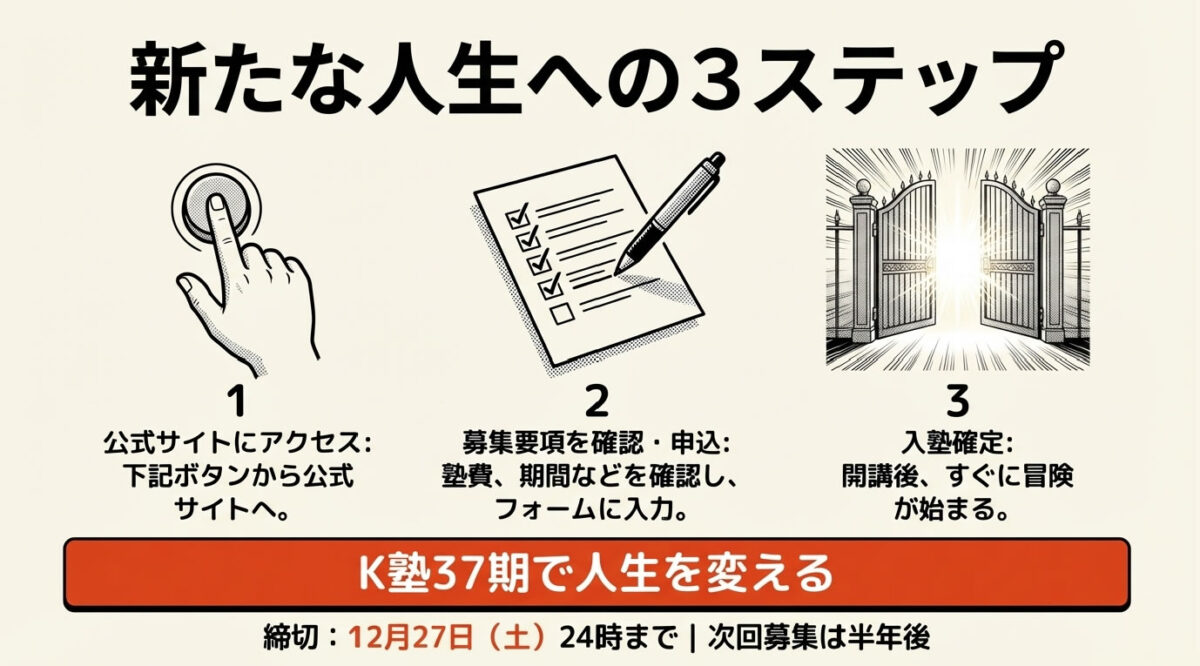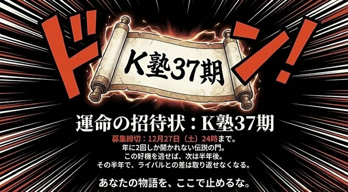 🚨 重要なお知らせ:K塾37期の入塾受付は2025年12月27日(土)24時まで!
