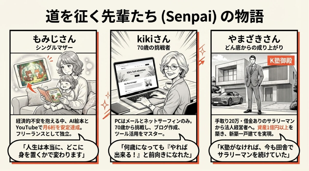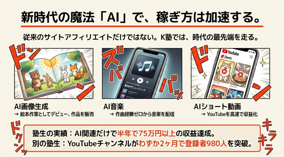 → K塾ではAI活用を積極的に取り入れており、絵本作成、音楽配信、YouTube運営など、最新の稼ぎ方を学べます。