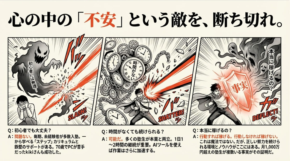 1日1〜2時間の作業で成果を出している塾生もいます。AIツールを活用すれば、作業時間をさらに短縮できます。